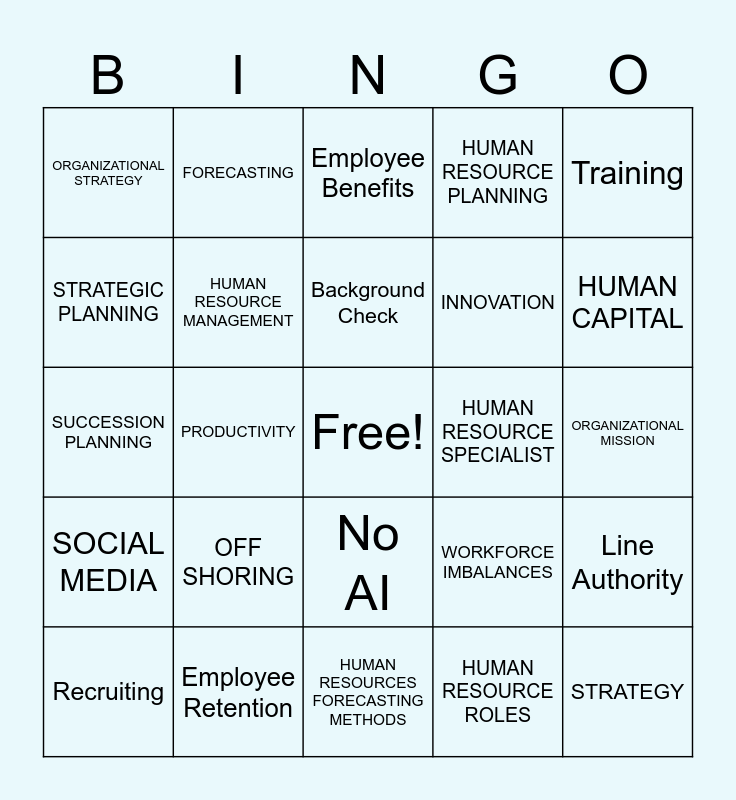 This bingo card has a free space and 38 words: CORE COMPETENCY, HUMAN RESOURCE GENERALIST, Management Process, HUMAN RESOURCE SPECIALIST, Line Authority, SOCIAL MEDIA, PRODUCTIVITY, ORGANIZATIONAL CULTURE, INNOVATION, HUMAN CAPITAL, STRATEGIC PLANNING, HUMAN RESOURCE MANAGEMENT, HUMAN RESOURCE ROLES, ORGANIZATIONAL MISSION, ORGANIZATIONAL STRATEGY, OFF SHORING, MULTINAITONAL CORPORATION, HUMAN RESOURCE PLANNING, ENVIRONMENTAL SCANNING, SUCCESSION PLANNING, FORECASTING, HUMAN RESOURCES FORECASTING METHODS, WORKFORCE IMBALANCES, STRATEGY, HRM, Staff Manager, No AI, Business Bears, HR Manager, EEOC, Ethics, Background Check, Credit Check, Training, Recruiting, Employee Retention, Employee Benefits and Employer Liability.