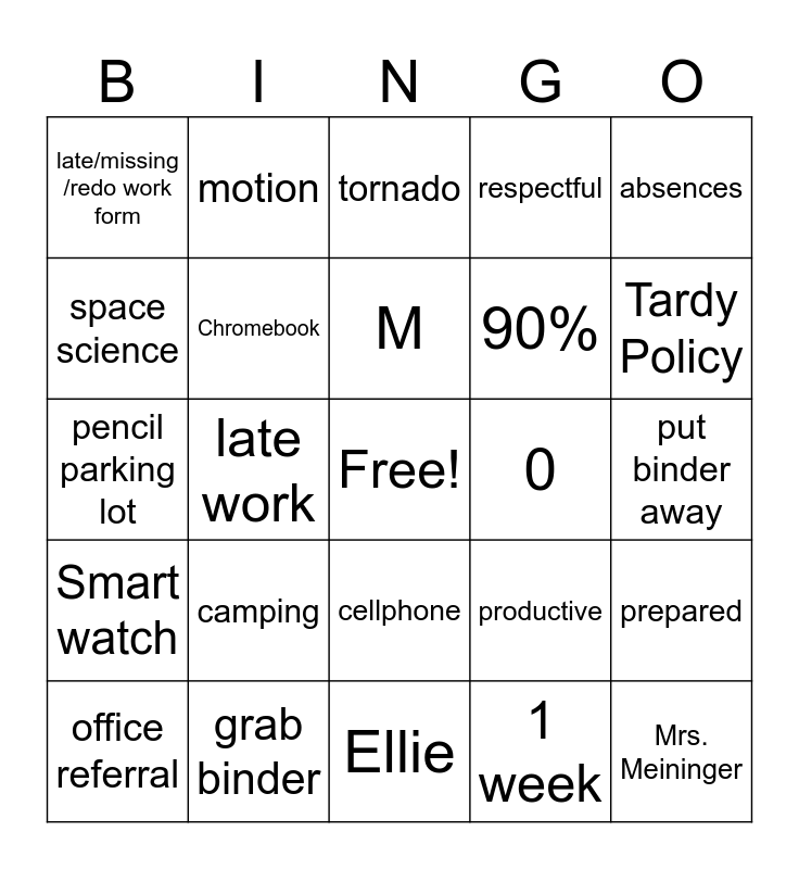 This bingo card has a free space and 49 words: back to school, Mrs. Meininger, 8th year, Ellie, camping, forces, motion, DNA, space science, pencil, Chromebook, respectful, prepared, productive, 30%, 70%, M, 0, Infinite Campus, absences, late work, 1 week, late/missing /redo work form, 90%, Google Classroom, Tardy Policy, office referral, detention, cellphone, Smart watch, food, drink, water bottle, hang up bag, grab binder, do starter, participate, no wandering, put binder away, wait at desk, bathroom passes, three hole punch, class cupboard, pop quizzes, pencil parking lot, tornado, fire, lockdown and no go zone.