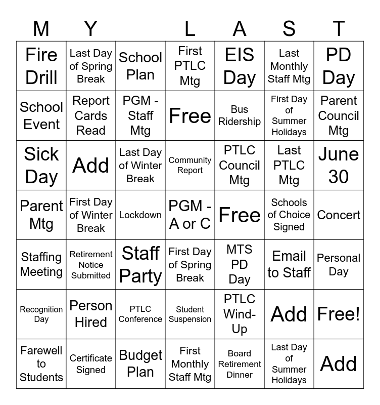 This bingo card has 50 words: Free!, First Day of Summer Holidays, Last Day of Summer Holidays, First Day of Winter Break, Last Day of Winter Break, First Day of Spring Break, Last Day of Spring Break, First Monthly Staff Mtg, Last Monthly Staff Mtg, MTS PD Day, PD Day, First PTLC Mtg, Last PTLC Mtg, PTLC Council Mtg, PTLC Conference, Concert, School Event, Parent Council Mtg, Farewell to Students, EIS Day, Bus Ridership, Lockdown, Fire Drill, Report Cards Read, Certificate Signed, PGM - A or C, PGM - Staff Mtg, Budget Plan, School Plan, Community Report, Timetable, Staffing Meeting, Person Hired, Student Suspension, Parent Mtg, Schools of Choice Signed, Email to Staff, Personal Day, Recognition Day, Sick Day, Staff Party, PTLC Wind-Up, Retirement Notice Submitted, Board Retirement Dinner, June 30, Free, Free, Add, Add and Add.