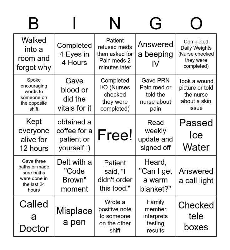 This bingo card has a free space and 24 words: Delt with a "Code Brown" moment, Misplace a pen, Completed I/O (Nurses checked they were completed), Called a Doctor, Completed Daily Weights (Nurse checked they were completed), Walked into a room and forgot why, Spoke encouraging words to someone on the opposite shift, Completed 4 Eyes in 4 Hours, Read weekly update and signed off, Patient said, "I didn't order this food.", Gave PRN Pain med or told the nurse about pain, Kept everyone alive for 12 hours, Heard, "Can I get a warm blanket?", Answered a call light, Gave blood or did the vitals for it, Family member interprets testing results, Passed Ice Water, Patient refused meds then asked for Pain meds 2 minutes later, Took a wound picture or told the nurse about a skin issue, obtained a coffee for a patient or yourself :), Checked tele boxes, Gave three baths or made sure baths were done in the last 24 hours, Answered a beeping IV and Wrote a positive note to someone on the other shift.