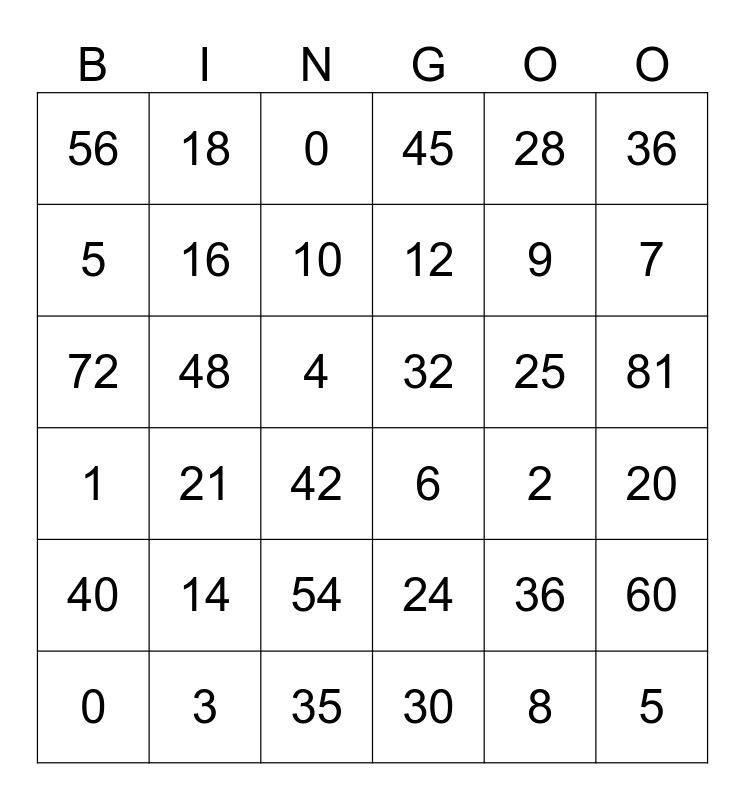 This bingo card has 36 words: 1, 21, 35, 12, 25, 81, 56, 3, 0, 24, 9, 36, 40, 48, 10, 45, 36, 20, 5, 16, 42, 6, 2, 60, 72, 18, 4, 30, 28, 7, 0, 14, 54, 32, 8 and 5.