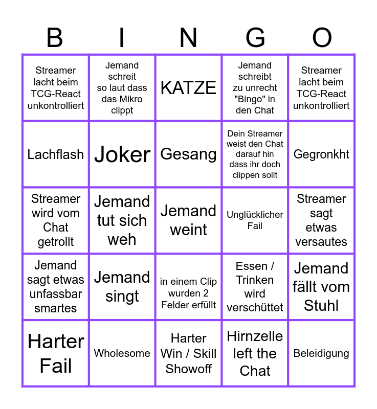 This bingo card has 34 words: 4 Leute erschrecken sich, Jemand flucht, Versprecher, Jemand sagt "Diggah", Streamer sagt etwas versautes, Streamer lacht beim TCG-React unkontrolliert, Jemand tut sich weh, in einem Clip wurden 2 Felder erfüllt, Jemand schreibt zu unrecht "Bingo" in den Chat, Jemand reacted auf einen React, Lachflash, Jemand schreit so laut dass das Mikro clippt, Harter Win / Skill Showoff, Hirnzelle left the Chat, Gegronkht, Streamer wird vom Chat getrollt, Wholesome, Gesang, Essen / Trinken wird verschüttet, Jemand fällt vom Stuhl, Harter Fail, Die Technik versagt, KATZE, Unglücklicher Fail, Beleidigung, Jemand sagt etwas unfassbar smartes, Joker, Ein Alert von Milschbaum ist zu sehen, Dein Streamer weist den Chat darauf hin dass ihr doch clippen sollt, Streamer lacht beim TCG-React unkontrolliert, Jemand tanzt, Jemand singt, Jemand weint and "Abonniert Twitch Clips Germany Hihihihi".