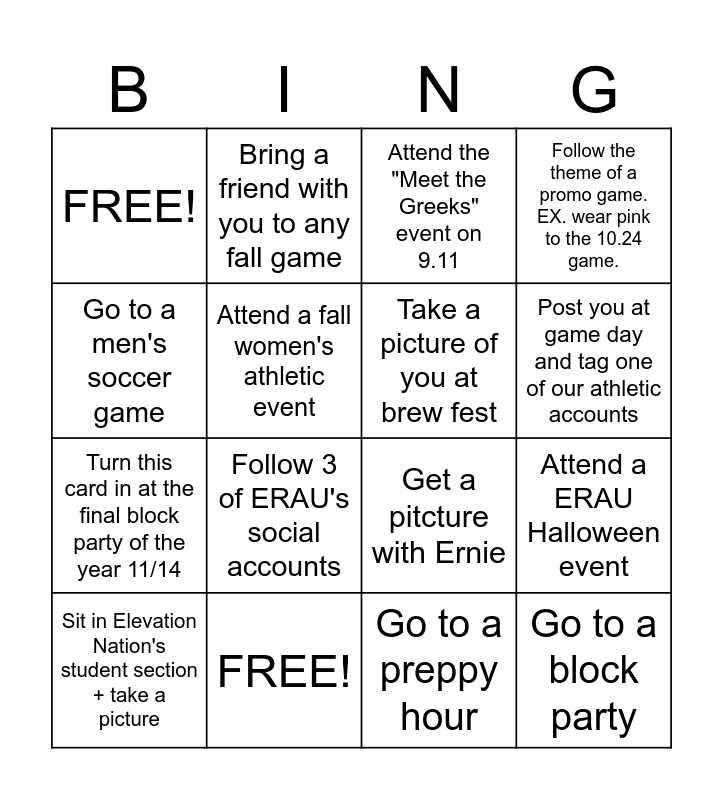 This bingo card has 16 words: Sit in Elevation Nation's student section + take a picture, FREE!, Attend the "Meet the Greeks" event on 9.11, Follow the theme of a promo game. EX. wear pink to the 10.24 game., Go to a men's soccer game, Bring a friend with you to any fall game, Get a pitcture with Ernie, Attend a ERAU Halloween event, FREE!, Attend a fall women's athletic event, Go to a preppy hour, Post you at game day and tag one of our athletic accounts, Turn this card in at the final block party of the year 11/14, Follow 3 of ERAU's social accounts, Take a picture of you at brew fest and Go to a block party.