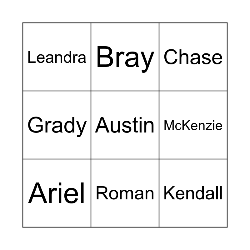 This bingo card has a free space and 10 words: Roman, Chase, Leandra, Kendall, Grady, Ariel, Bray, Olive, McKenzie and Scarlet.