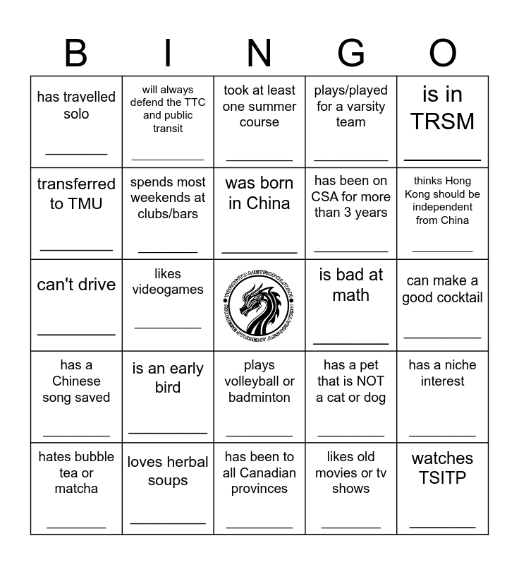 This bingo card has a free space and 36 words: is fluent in canto and mando _________, has been to 3 or more continents ________, is the eldest child _______, spends most weekends at clubs/bars ________, has a pet that is NOT a cat or dog _________, has a Chinese song saved _________, was born in China ________, is in Science _______, is in TRSM ______, has completed a marathon ________, likes videogames _________, plays/played for a varsity team __________, has had 5 or more jobs __________, is bad at math ________, thinks Hong Kong should be independent from China __________, has travelled solo ________, likes the rac over the mac ________, is an early bird _________, watches TSITP _______, took at least one summer course _________, can make a good cocktail __________, has a niche interest _________, loves herbal soups _________, hates bubble tea or matcha ________, has been to all Canadian provinces _________, will always defend the TTC and public transit ____________, can't drive ________, has high prescription glasses _________, has been on CSA for more than 3 years __________, transferred to TMU ________, is currently reading a book __________, likes movies over tv shows _________, likes old movies or tv shows ________, plays volleyball or badminton _________, likes raves _______ and is in FCS _______.