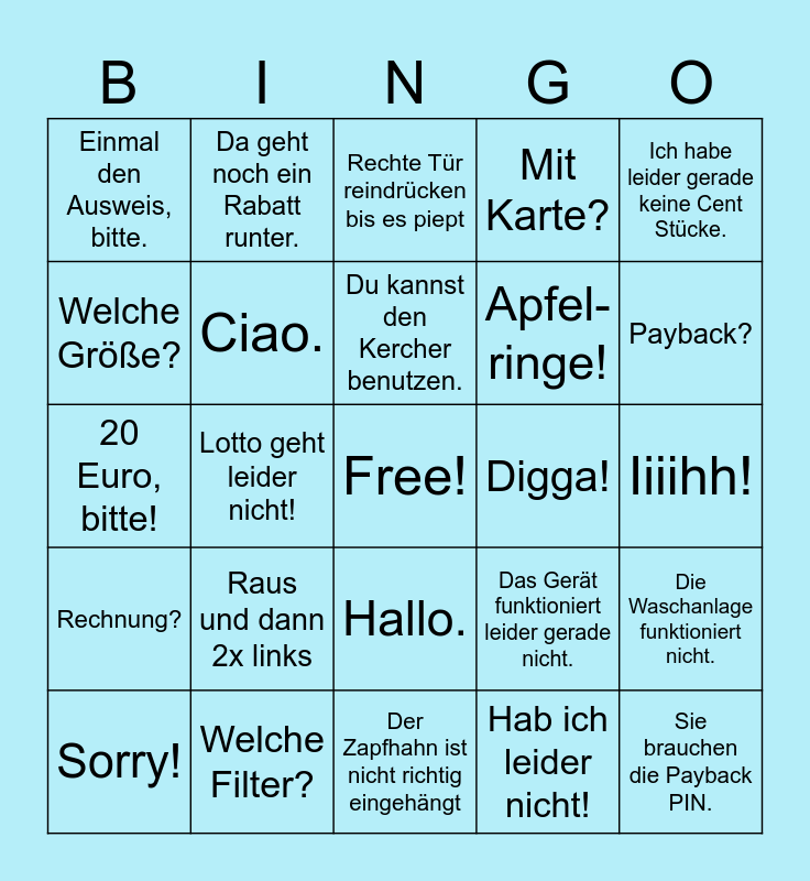 This bingo card has a free space and 24 words: Raus und dann 2x links, Welche Filter?, Du kannst den Kercher benutzen., Sorry!, Ich habe leider gerade keine Cent Stücke., Einmal den Ausweis, bitte., Welche Größe?, Da geht noch ein Rabatt runter., Digga!, Hallo., Apfel-ringe!, 20 Euro, bitte!, Das Gerät funktioniert leider gerade nicht., Die Waschanlage funktioniert nicht., Ciao., Hab ich leider nicht!, Iiiihh!, Rechte Tür reindrücken bis es piept, Payback?, Lotto geht leider nicht!, Sie brauchen die Payback PIN., Rechnung?, Mit Karte? and Der Zapfhahn ist nicht richtig eingehängt.