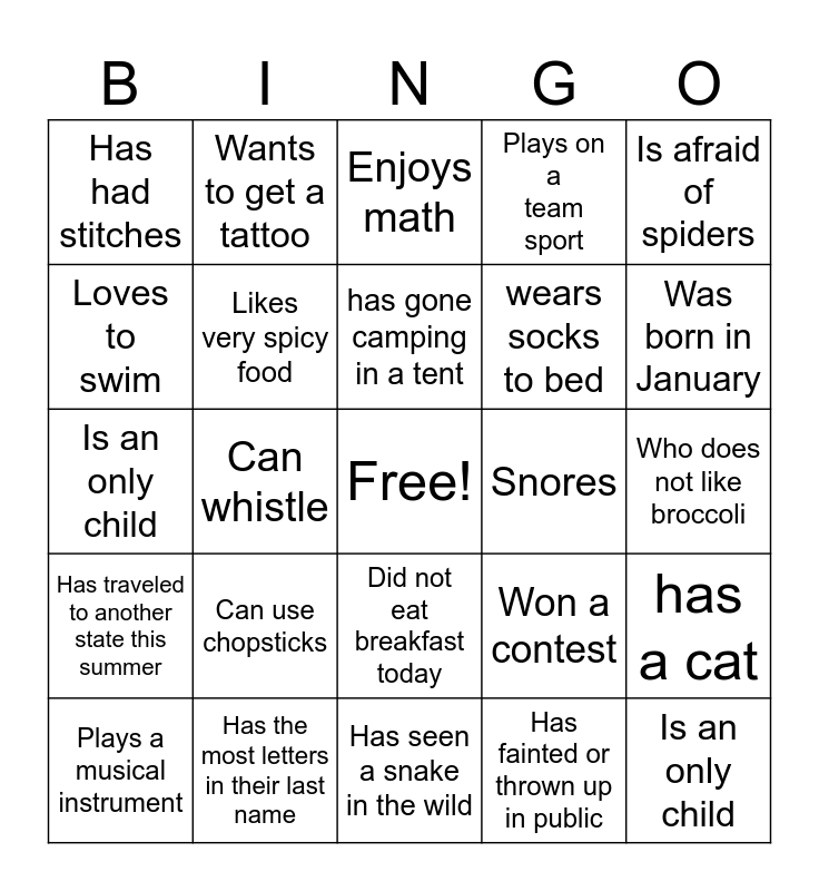 This bingo card has a free space and 29 words: Plays a musical instrument, Loves to dance, Can whistle, Who has more than two siblings, Has had stitches, Enjoys math, Likes very spicy food, Can use chopsticks, Snores, Has the most letters in their last name, Who does not like broccoli, Is an only child, Has seen a snake in the wild, Has fainted or thrown up in public, Was born in January, Who has read "The Lightning Thief" more than twice, Did not eat breakfast today, Has traveled to another state this summer, Is afraid of spiders, Is an only child, Won a contest, likes roller coasters, wears socks to bed, Loves to swim, Plays on a team sport, Wants to get a tattoo, has a cat, has gone camping in a tent and Driven a go-cart.