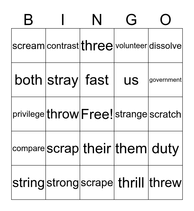This bingo card has a free space and 29 words: string, street, throw, spring, scream, three, stray, scrap, strange, strong, scratch, threw, scrape, thrill, government, your, their, compare, dissolve, privilege, them, contribution, us, both, volunteer, contrast, duty, fast and pull.