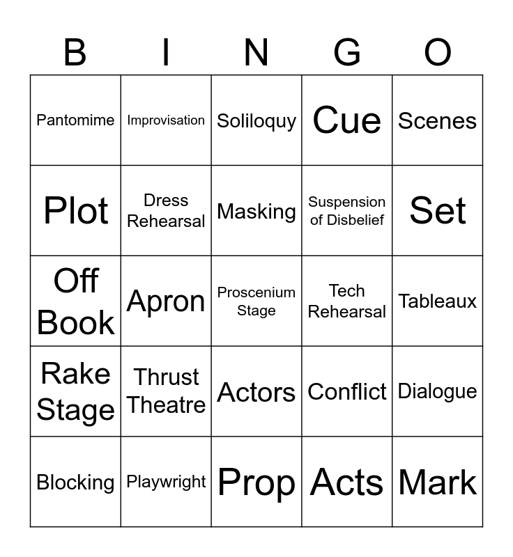 This bingo card has a free space and 26 words: Actors, Acts, Masking, Playwright, Scenes, Pantomime, Plot, Improvisation, Tableaux, Conflict, Suspension of Disbelief, Off Book, Dialogue, Blocking, Apron, Monologue, Cue, Rake Stage, Soliloquy, Mark, Set, Prop, Tech Rehearsal, Thrust Theatre, Dress Rehearsal and Set.