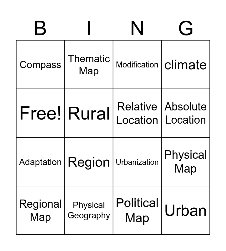 This bingo card has 16 words: Physical Geography, Physical Map, Modification, Compass, Adaptation, Thematic Map, Urbanization, Political Map, Free!, Rural, Regional Map, climate, Region, Absolute Location, Relative Location and Urban.