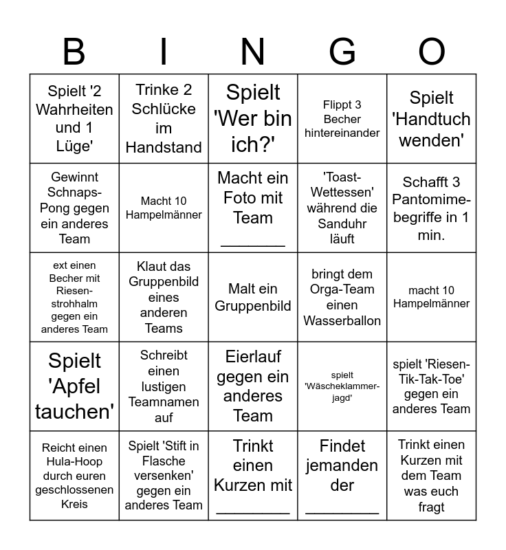 This bingo card has a free space and 24 words: Schreibt einen lustigen Teamnamen auf, Spielt 'Stift in Flasche versenken' gegen ein anderes Team, Macht ein Foto mit Team _______, Reicht einen Hula-Hoop durch euren geschlossenen Kreis, Spielt 'Handtuch wenden', Spielt '2 Wahrheiten und 1 Lüge', Gewinnt Schnaps-Pong gegen ein anderes Team, Trinke 2 Schlücke im Handstand, bringt dem Orga-Team einen Wasserballon, Eierlauf gegen ein anderes Team, 'Toast-Wettessen' während die Sanduhr läuft, ext einen Becher mit Riesen-strohhalm gegen ein anderes Team, spielt 'Wäscheklammer-jagd', spielt 'Riesen-Tik-Tak-Toe' gegen ein anderes Team, Macht 10 Hampelmänner, Findet jemanden der ________, macht 10 Hampelmänner, Spielt 'Wer bin ich?', Schafft 3 Pantomime-begriffe in 1 min., Klaut das Gruppenbild eines anderen Teams, Trinkt einen Kurzen mit dem Team was euch fragt, Spielt 'Apfel tauchen', Flippt 3 Becher hintereinander and Trinkt einen Kurzen mit ________.