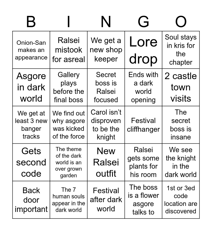 This bingo card has a free space and 24 words: The theme of the dark world is an over grown garden, The 7 human souls appear in the dark world, Secret boss is Ralsei focused, Back door important, Soul stays in kris for the chapter, Onion-San makes an appearance, Asgore in dark world, Ralsei mistook for asreal, Festival cliffhanger, New Ralsei outfit, Ends with a dark world opening, We get at least 3 new banger tracks, Ralsei gets some plants for his room, We see the knight in the dark world, Gallery plays before the final boss, The boss is a flower asgore talks to, The secret boss is insane, We get a new shop keeper, 2 castle town visits, We find out why asgore was kicked of the force, 1st or 3ed code location are discovered, Gets second code, Lore drop and Festival after dark world.