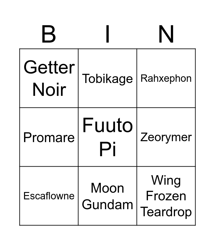 This bingo card has a free space and 8 words: Zeorymer, Rahxephon, Tobikage, Escaflowne, Getter Noir, Wing Frozen Teardrop, Promare and Moon Gundam.