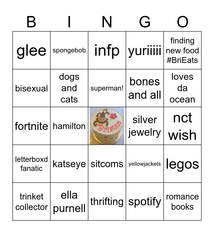 This bingo card has a free space and 24 words: katseye, ella purnell, superman!, trinket collector, finding new food #BriEats, glee, bisexual, spongebob, silver jewelry, sitcoms, bones and all, fortnite, yellowjackets, legos, dogs and cats, spotify, nct wish, infp, loves da ocean, hamilton, romance books, letterboxd fanatic, yuriiiii and thrifting.