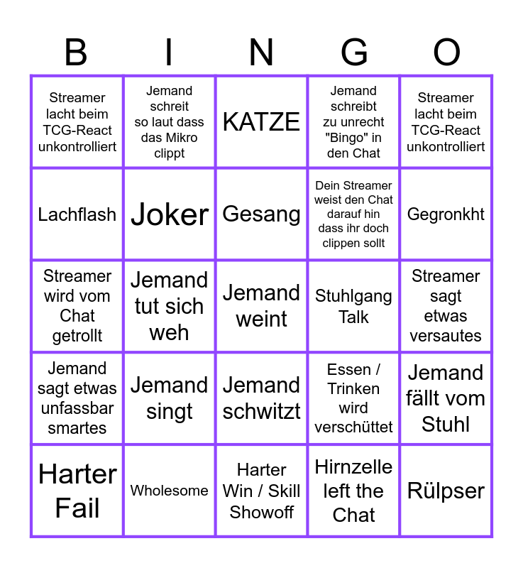 This bingo card has 34 words: 4 Leute erschrecken sich, Jemand flucht, Versprecher, Jemand sagt "Diggah", Streamer sagt etwas versautes, Streamer lacht beim TCG-React unkontrolliert, Jemand tut sich weh, Jemand schwitzt, Jemand schreibt zu unrecht "Bingo" in den Chat, Jemand reacted auf einen React, Lachflash, Jemand schreit so laut dass das Mikro clippt, Harter Win / Skill Showoff, Hirnzelle left the Chat, Gegronkht, Streamer wird vom Chat getrollt, Wholesome, Gesang, Essen / Trinken wird verschüttet, Jemand fällt vom Stuhl, Harter Fail, Die Technik versagt, KATZE, Stuhlgang Talk, Rülpser, Jemand sagt etwas unfassbar smartes, Joker, Ein Alert von Milschbaum ist zu sehen, Dein Streamer weist den Chat darauf hin dass ihr doch clippen sollt, Streamer lacht beim TCG-React unkontrolliert, Jemand tanzt, Jemand singt, Jemand weint and "Abonniert Twitch Clips Germany Hihihihi".