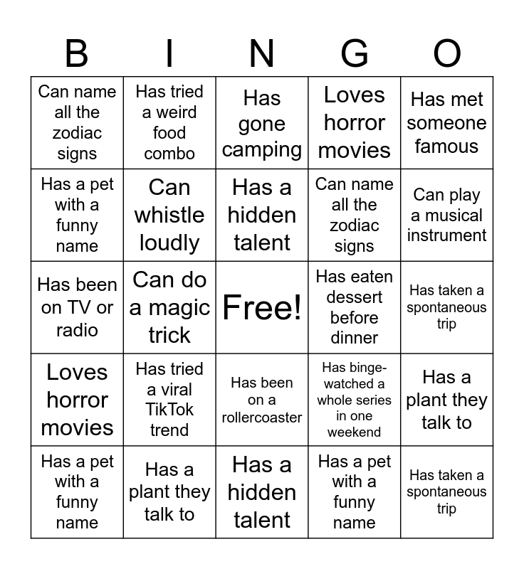This bingo card has a free space and 89 words: Loves pineapple on pizza, Can whistle loudly, Has a hidden talent, Is afraid of heights, Has met someone famous, Is afraid of heights, Has a hidden talent, Has a tattoo, Has tried a weird food combo, Has gone camping, Is a night owl, Has taken a spontaneous trip, Loves horror movies, Has a plant they talk to, Has been on a rollercoaster, Has tried a viral TikTok trend, Can play a musical instrument, Has a pet with a funny name, Loves spicy food, Is a morning person, Has binge-watched a whole series in one weekend, Has ever worked a night shift, Can name all the zodiac signs, Can do a magic trick, Has been on TV or radio, Can touch their toes without bending their knees, Has taken a road trip longer than 5 hours, Has played a prank on someone, Has a playlist for every mood, Loves pineapple on pizza, Can whistle loudly, Has a hidden talent, Is afraid of heights, Has met someone famous, Has a tattoo, Has tried a weird food combo, Has gone camping, Is a night owl, Has taken a spontaneous trip, Loves horror movies, Has a plant they talk to, Has been on a rollercoaster, Has tried a viral TikTok trend, Can play a musical instrument, Has a pet with a funny name, Loves spicy food, Is a morning person, Has binge-watched a whole series in one weekend, Has ever worked a night shift, Can name all the zodiac signs, Can do a magic trick, Has been on TV or radio, Can touch their toes without bending their knees, Has taken a road trip longer than 5 hours, Has played a prank on someone, Has a playlist for every mood, Has a favorite childhood snack, Has eaten dessert before dinner, Has cried during a movie, Loves pineapple on pizza, Can whistle loudly, Has a hidden talent, Is afraid of heights, Has met someone famous, Has a tattoo, Has tried a weird food combo, Has gone camping, Is a night owl, Has taken a spontaneous trip, Loves horror movies, Has a plant they talk to, Has been on a rollercoaster, Has tried a viral TikTok trend, Can play a musical instrument, Has a pet with a funny name, Loves spicy food, Is a morning person, Has binge-watched a whole series in one weekend, Has ever worked a night shift, Can name all the zodiac signs, Can do a magic trick, Has been on TV or radio, Can touch their toes without bending their knees, Has taken a road trip longer than 5 hours, Has played a prank on someone, Has a playlist for every mood, Has a favorite childhood snack, Has eaten dessert before dinner and Has cried during a movie.