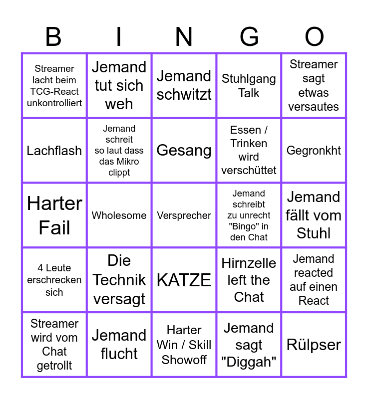 This bingo card has 25 words: 4 Leute erschrecken sich, Jemand flucht, Versprecher, Jemand sagt "Diggah", Streamer sagt etwas versautes, Streamer lacht beim TCG-React unkontrolliert, Jemand tut sich weh, Jemand schwitzt, Jemand schreibt zu unrecht "Bingo" in den Chat, Jemand reacted auf einen React, Lachflash, Jemand schreit so laut dass das Mikro clippt, Harter Win / Skill Showoff, Hirnzelle left the Chat, Gegronkht, Streamer wird vom Chat getrollt, Wholesome, Gesang, Essen / Trinken wird verschüttet, Jemand fällt vom Stuhl, Harter Fail, Die Technik versagt, KATZE, Stuhlgang Talk and Rülpser.