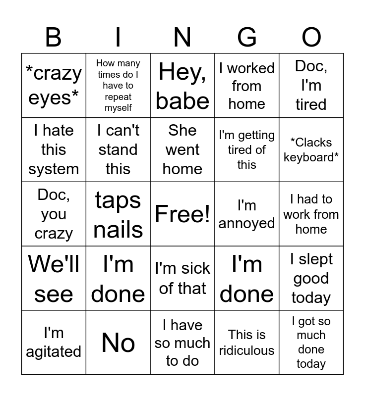 This bingo card has a free space and 24 words: I'm done, No, She went home, I'm agitated, Doc, I'm tired, *crazy eyes*, I hate this system, How many times do I have to repeat myself, I'm annoyed, I'm sick of that, I'm getting tired of this, Doc, you crazy, I'm done, I slept good today, I can't stand this, This is ridiculous, I had to work from home, Hey, babe, *Clacks keyboard*, taps nails, I got so much done today, We'll see, I worked from home and I have so much to do.
