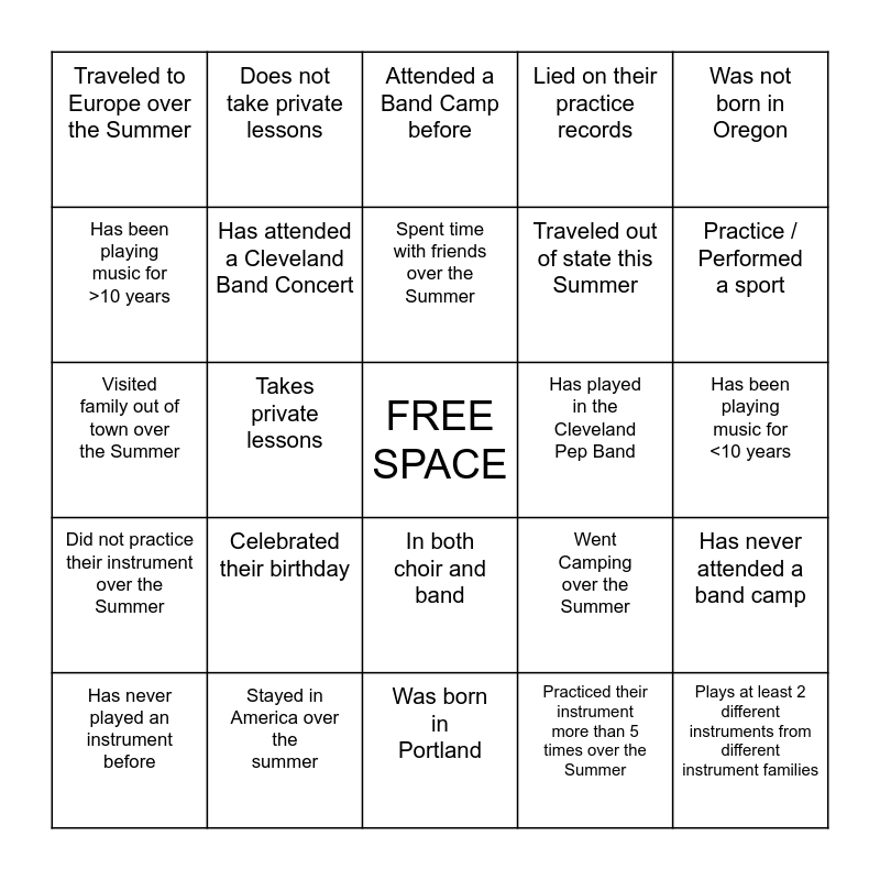 This bingo card has a free space and 24 words: Celebrated their birthday, Stayed in America over the summer, Spent time with friends over the Summer, Has never played an instrument before, Was not born in Oregon, Traveled to Europe over the Summer, Has been playing music for >10 years, Does not take private lessons, Has played in the Cleveland Pep Band, In both choir and band, Traveled out of state this Summer, Visited family out of town over the Summer, Went Camping over the Summer, Has never attended a band camp, Has attended a Cleveland Band Concert, Practiced their instrument more than 5 times over the Summer, Has been playing music for <10 years, Attended a Band Camp before, Practice / Performed a sport, Takes private lessons, Plays at least 2 different instruments from different instrument families, Did not practice their instrument over the Summer, Lied on their practice records and Was born in Portland.