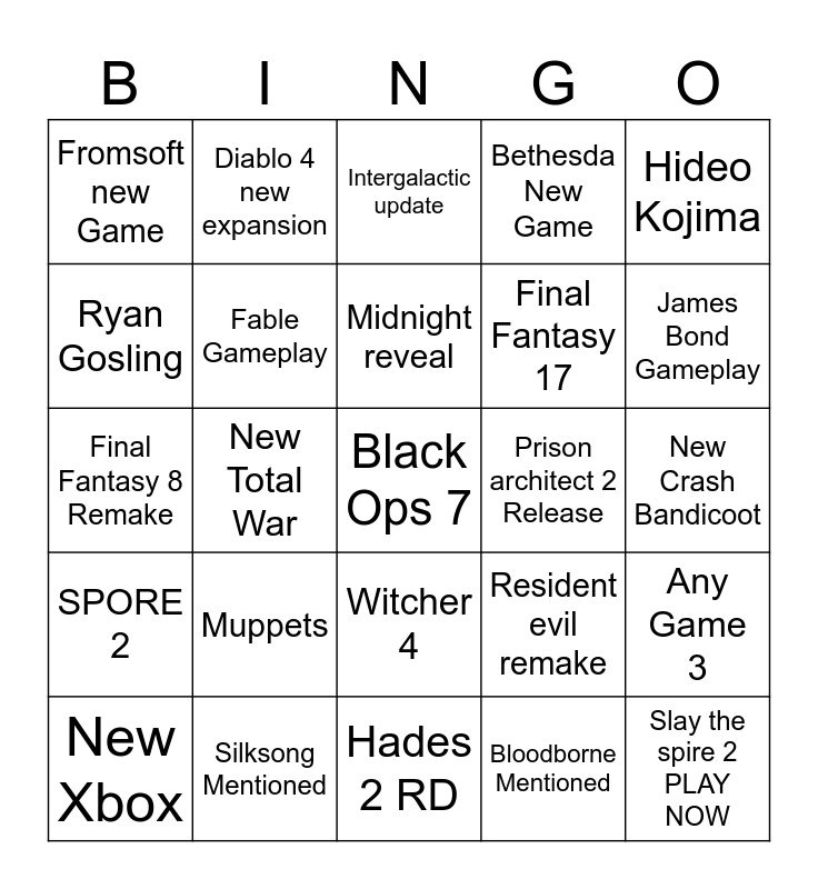 This bingo card has a free space and 24 words: Muppets, Silksong Mentioned, Midnight reveal, New Xbox, Hideo Kojima, Fromsoft new Game, Ryan Gosling, Diablo 4 new expansion, Prison architect 2 Release, Witcher 4, Final Fantasy 17, Final Fantasy 8 Remake, Resident evil remake, Any Game 3, Fable Gameplay, Bloodborne Mentioned, New Crash Bandicoot, Intergalactic update, James Bond Gameplay, New Total War, Slay the spire 2 PLAY NOW, SPORE 2, Bethesda New Game and Hades 2 RD.