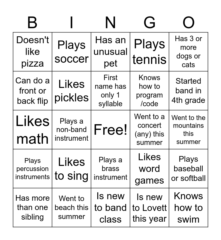 This bingo card has a free space and 29 words: Has more than one sibling, Born outside of US, Plays a non-band instrument, Traveled out of state this summer, Doesn't like pizza, Has an unusual pet, Likes pickles, Likes to sing, Went to a concert (any) this summer, Went to beach this summer, Went to the mountains this summer, Knows how to swim, Is new to band class, Is new to Lovett this year, Started band in 4th grade, Plays a woodwind instrument, Plays a brass instrument, Plays percussion instruments, Has 3 or more dogs or cats, Likes math, Likes word games, Knows how to juggle, Knows how to program /code, Can do a front or back flip, Plays tennis, Plays soccer, Plays baseball or softball, First name has only 1 syllable and First name has more than 2 syllables.