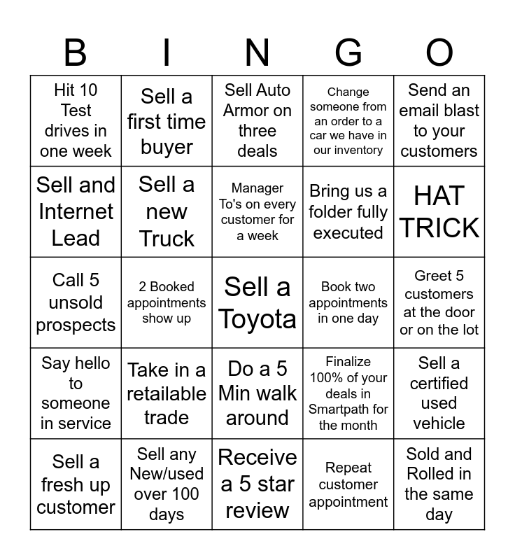 This bingo card has a free space and 24 words: Take in a retailable trade, Sell any New/used over 100 days, Manager To's on every customer for a week, Sell a fresh up customer, Send an email blast to your customers, Hit 10 Test drives in one week, Sell and Internet Lead, Sell a first time buyer, Book two appointments in one day, Do a 5 Min walk around, Bring us a folder fully executed, Call 5 unsold prospects, Finalize 100% of your deals in Smartpath for the month, Sell a certified used vehicle, Sell a new Truck, Repeat customer appointment, Greet 5 customers at the door or on the lot, Sell Auto Armor on three deals, HAT TRICK, 2 Booked appointments show up, Sold and Rolled in the same day, Say hello to someone in service, Change someone from an order to a car we have in our inventory and Receive a 5 star review.