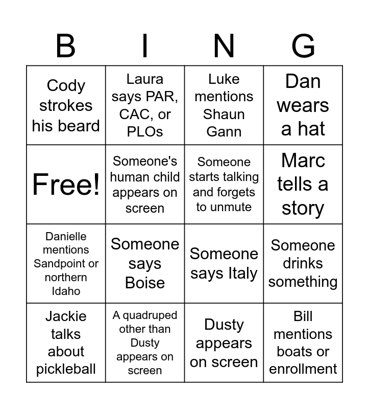 This bingo card has 16 words: A quadruped other than Dusty appears on screen, Someone drinks something, Luke mentions Shaun Gann, Cody strokes his beard, Danielle mentions Sandpoint or northern Idaho, Laura says PAR, CAC, or PLOs, Someone says Italy, Dusty appears on screen, Free!, Someone's human child appears on screen, Jackie talks about pickleball, Dan wears a hat, Someone says Boise, Marc tells a story, Someone starts talking and forgets to unmute and Bill mentions boats or enrollment.