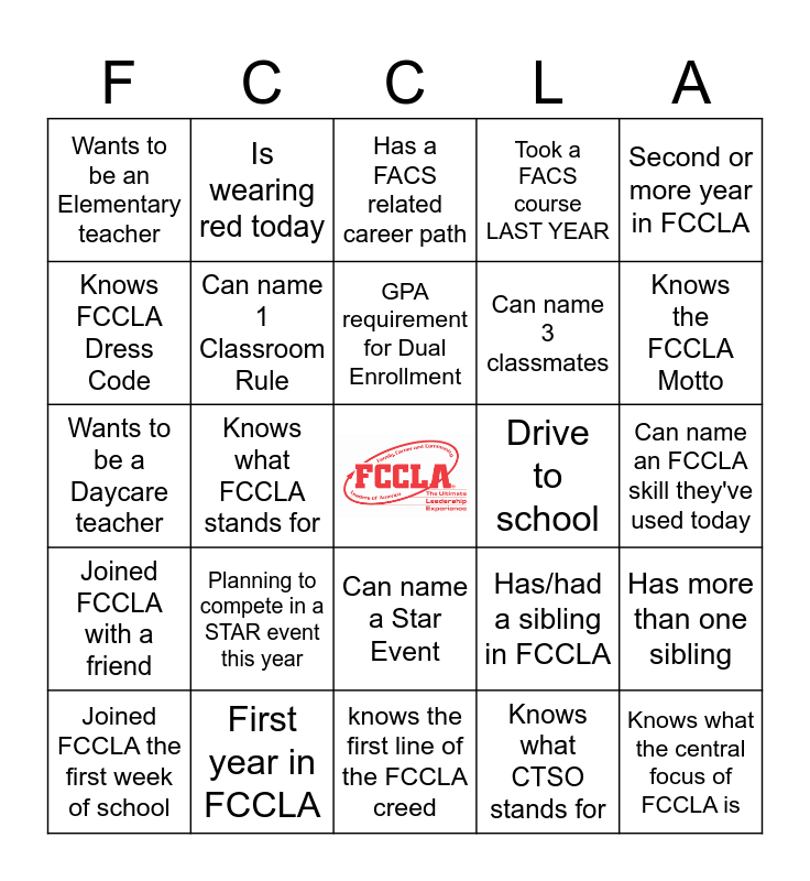 This bingo card has a free space and 24 words: Planning to compete in a STAR event this year, First year in FCCLA, GPA requirement for Dual Enrollment, Joined FCCLA the first week of school, Second or more year in FCCLA, Wants to be an Elementary teacher, Knows FCCLA Dress Code, Is wearing red today, Drive to school, Can name a Star Event, Can name 3 classmates, Wants to be a Daycare teacher, Has/had a sibling in FCCLA, Has more than one sibling, Can name 1 Classroom Rule, Knows what CTSO stands for, Can name an FCCLA skill they've used today, Has a FACS related career path, Knows the FCCLA Motto, Knows what FCCLA stands for, Knows what the central focus of FCCLA is, Joined FCCLA with a friend, Took a FACS course LAST YEAR and knows the first line of the FCCLA creed.