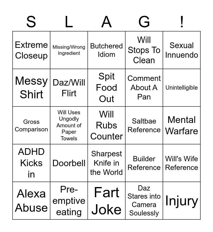 This bingo card has a free space and 51 words: Slag, Injury, "You know what though", Fart Joke, Doorbell, Will OCD Reference, Missing/Wrong Ingredient, Microwave Not In Kitchen Joke, Messy Shirt, Non-Committal Noises, Daz/Will Flirt, Will Stops To Clean, Will's Wife Reference, Builder Reference, Food Gets Burnt, Unintentional Coke Ad, Spit Food Out, Saltbae Reference, Camera Correction (Incorrectly), Sexual Innuendo, Will Uses Ungodly Amount of Paper Towels, Daz Stares into Camera Soulessly, Extreme Closeup, Comment About A Pan, Singing, Pleasantly Surprised Face, Unintelligible, Uncontrollable Physical Reaction, Alexa Abuse, Butchered Idiom, Snacking, Film Reference, Uncontrollable Guttural Laughter, Gizmo, Unholy Mess Spawned, Pre-emptive eating, Classist Joke, Will pranks Daz, Daz pranks Will, Accent Butchery, Mental Warfare, ADHD Kicks in, Monologue to Audience, Daz slags off Will's House, Burping, Delaying The Inevitable, Gross Comparison, Bro, Unbridled Confidence, Sharpest Knife in the World and Best Can Opener in the World.
