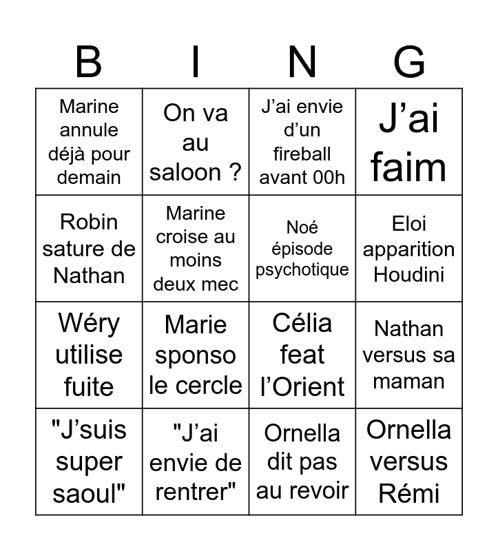 This bingo card has 16 words: "J’suis super saoul", "J’ai envie de rentrer", J’ai envie d’un fireball avant 00h, J’ai faim, Robin sature de Nathan, On va au saloon ?, Célia feat l’Orient, Nathan versus sa maman, Marine annule déjà pour demain, Marine croise au moins deux mec, Ornella dit pas au revoir, Eloi apparition Houdini, Wéry utilise fuite, Marie sponso le cercle, Noé épisode psychotique and Ornella versus Rémi.