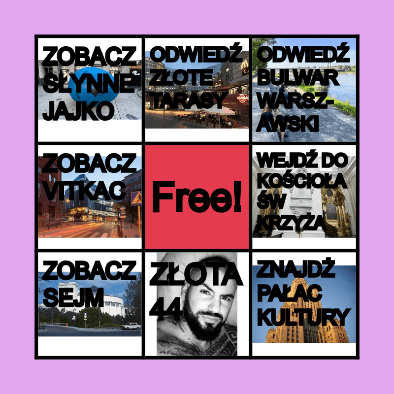 This bingo card has 8 images, a free space and 8 words: WEJDŹ DO KOŚCIOŁA ŚW KRZYŻA, ODWIEDŹ BULWAR WARSZ-AWSKI, ODWIEDŹ ZŁOTE TARASY, ZOBACZ SEJM, ZOBACZ SŁYNNE JAJKO, ZNAJDŻ PAŁAC KULTURY, ZOBACZ VITKAC and ZŁOTA 44.