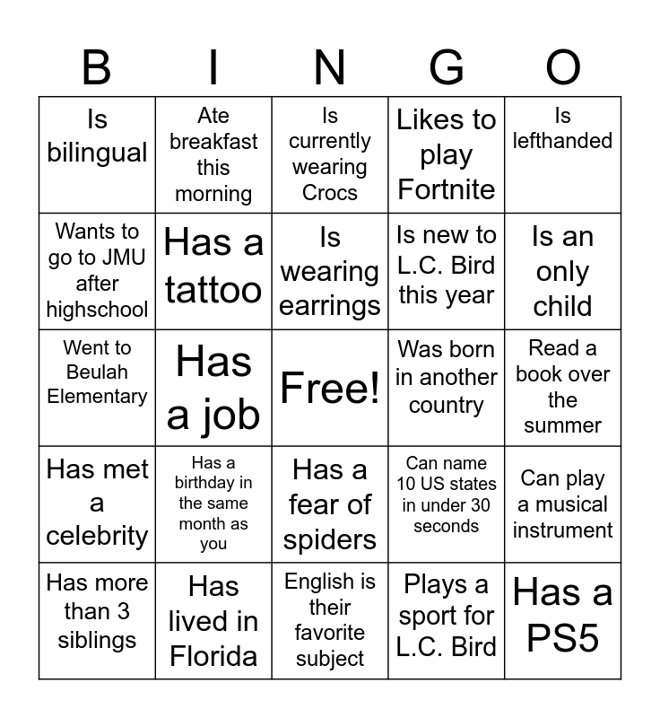 This bingo card has a free space and 29 words: Has more than 3 siblings, Went out of the country over the summer, Has a job, Has more than 3 pets at home, Is bilingual, Is currently wearing Crocs, Has a tattoo, Has a birthday in the same month as you, Was born in another country, Has lived in Florida, Read a book over the summer, Has a PS5, English is their favorite subject, Plays a sport for L.C. Bird, Is an only child, Takes Chorus this year, Has a fear of spiders, Has met a celebrity, Is lefthanded, Went to Beulah Elementary, Can name 10 US states in under 30 seconds, Shares a room with a sibling, Is new to L.C. Bird this year, Wants to go to JMU after highschool, Likes to play Fortnite, Ate breakfast this morning, Can play a musical instrument, Is wearing earrings and Has on a black sweatshirt.