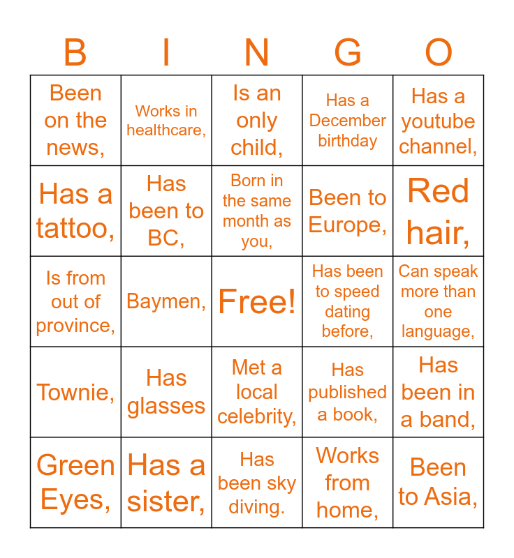 This bingo card has a free space and 24 words: Has glasses, Has a sister,, Born in the same month as you,, Green Eyes,, Has a youtube channel,, Been on the news,, Has a tattoo,, Works in healthcare,, Has been to speed dating before,, Met a local celebrity,, Been to Europe,, Is from out of province,, Has published a book,, Has been in a band,, Has been to BC,, Works from home,, Can speak more than one language,, Is an only child,, Red hair,, Baymen,, Been to Asia,, Townie,, Has a December birthday and Has been sky diving..