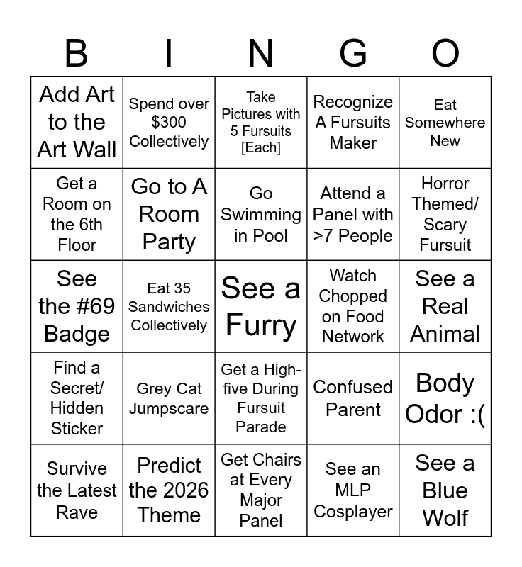 This bingo card has a free space and 24 words: Grey Cat Jumpscare, Predict the 2026 Theme, Go Swimming in Pool, Survive the Latest Rave, Eat Somewhere New, Add Art to the Art Wall, Get a Room on the 6th Floor, Spend over $300 Collectively, Watch Chopped on Food Network, Get a High-five During Fursuit Parade, Attend a Panel with >7 People, See the #69 Badge, Confused Parent, Body Odor :(, Go to A Room Party, See an MLP Cosplayer, See a Real Animal, Take Pictures with 5 Fursuits [Each], Horror Themed/ Scary Fursuit, Eat 35 Sandwiches Collectively, See a Blue Wolf, Find a Secret/ Hidden Sticker, Recognize A Fursuits Maker and Get Chairs at Every Major Panel.