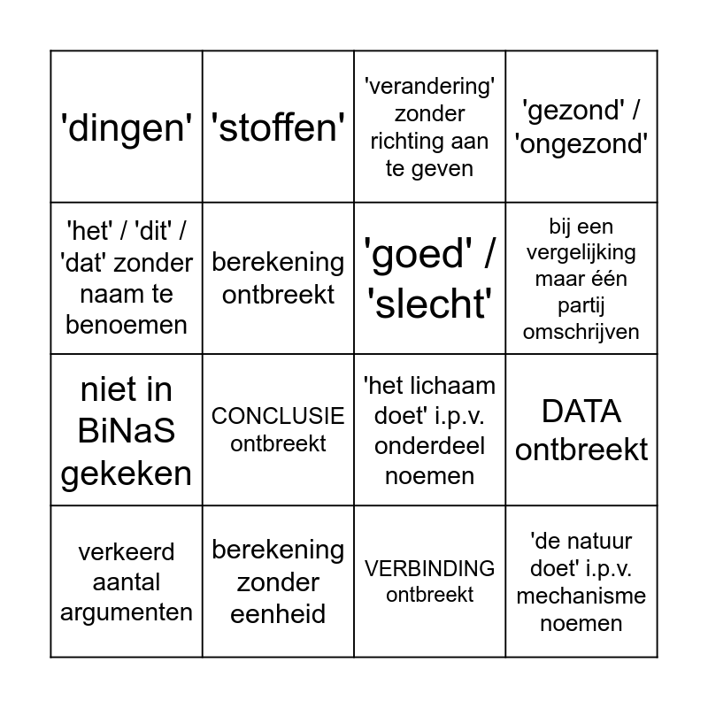 This bingo card has 16 words: berekening zonder eenheid, DATA ontbreekt, 'verandering' zonder richting aan te geven, 'dingen', niet in BiNaS gekeken, 'stoffen', 'het lichaam doet' i.p.v. onderdeel noemen, VERBINDING ontbreekt, 'het' / 'dit' / 'dat' zonder naam te benoemen, berekening ontbreekt, verkeerd aantal argumenten, 'gezond' / 'ongezond', CONCLUSIE ontbreekt, bij een vergelijking maar één partij omschrijven, 'goed' / 'slecht' and 'de natuur doet' i.p.v. mechanisme noemen.