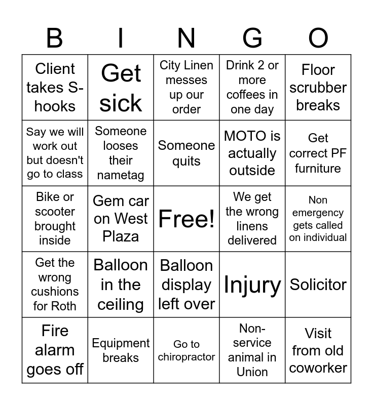 This bingo card has a free space and 24 words: Fire alarm goes off, Balloon in the ceiling, Someone quits, Non-service animal in Union, Floor scrubber breaks, Client takes S-hooks, Get sick, City Linen messes up our order, We get the wrong linens delivered, Non emergency gets called on individual, Bike or scooter brought inside, Someone looses their nametag, Injury, Solicitor, Say we will work out but doesn't go to class, Equipment breaks, Go to chiropractor, Drink 2 or more coffees in one day, Get correct PF furniture, Get the wrong cushions for Roth, Gem car on West Plaza, Balloon display left over, MOTO is actually outside and Visit from old coworker.