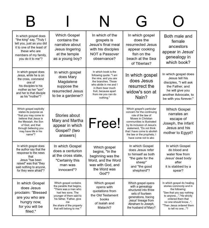 This bingo card has a free space and 34 words: Which gospel contains the parable that begins, "A man was going down from Jerusalem to Jericho, and fell into the hands of robbers"?, Which gospel opens with a genealogy structured into three sets of fourteen generations, tracing Jesus' lineage from Abraham to Joseph, the husband of Mary?, Which of the following gospels tells of Jesus' driving the money changers out of the temple near the beginning of his ministry?, In which gospel do the wise men appear?, In which gospel does the author say that the response to the news that Jesus "has been raised" was that "they said nothing to anyone, for they were afraid"?, In which gospel does Mary Magdalene suppose the resurrected Jesus to be a gardener?, Both male and female ancestors appear in Jesus' genealogy in which book?, In which Gospel does Jesus proclaim: “Blessed are you who are hungry now, for you will be filled.", Which Gospel contains the narrative about Jesus lingering at the temple as a young boy?, The Parable of the Good Samaritan is unique to which gospel?, In which book is the following quote: "I am the vine, and you are the branches. Those who abide in me and I in them bear much fruit, because apart from me you can do nothing.", In which of the gospels is Jesus's final meal with his disciples NOT a Passover observance?, Which is the only gospel to recount Jesus' action of washing his disciples' feet at their final meal the night before his crucifixion?, Which gospel begins, "The beginning of the good news of Jesus Christ, the Son of God"?, Which gospel's particular concern for the continuing role of the law of Moses in Christian communities is illustrated by its inclusion of Jesus's statement, "Do not think that I have come to abolish the law or the prophets; I have come not to abo, In which gospel does Jesus tell his disciples, "I will ask the Father, and he will give you another Advocate, to be with you forever.", Which gospel contains the parable that begins, "There was a man who had two sons. The younger of them said to his father, 'Father, give me the share of the property that will belong to me.'", Which gospel explicitly states its purpose as "that you may come to believe that Jesus is the Messiah, the Son of God, and that through believing you may have life in his name"?, In which Gospel does a centurion at the cross state, "Certainly this man was innocent"?, In which Gospel does Jesus refer to himself as both "the gate for the sheep" and "the good shepherd"?, Which gospel begins, "In the beginning was the Word, and the Word was with God, and the Word was God"?, In which Gospel does Anna, a prophet living in the temple, praise God and speak about Jesus to all looking for the redemption of Jerusalem?, In which gospel does "the king" say, "Truly I tell you, just as you did it to one of the least of these who are members of my family, you do it to me"?, Which Gospel narrates an escape of Joseph, the infant Jesus and his mother to Egypt?, Which gospel opens with quotations from the Old Testament books of Isaiah and Malachi?, In which gospel do healing stories commonly end in the following: "See that you say nothing to anyone...","He strictly ordered them that no one should know...", "Then Jesus ordered them to tell no one..."?, In which gospel does the resurrected Jesus appear cooking fish on the beach at the Sea of Tiberias?, Which Gospel recorded both the birth story of John the Baptist and the birth story of Jesus?, In which gospel does Jesus resurrect the widow's son at Nain?, In which gospel does Jesus, while he is on the cross, commend one of his disciples to his mother as her "son" and her to that disciple as his "mother"?, In which gospel do we find the quote "Today you will be with me in Paradise."?, Stories about Mary and Martha appear in which Gospel? (two answers), In which Gospel do blood and water flow from Jesus' dead body after it is stabbed by a spear? and Where can NOT you find Jesus telling a parable about a sower who sows seed in different types of ground?.