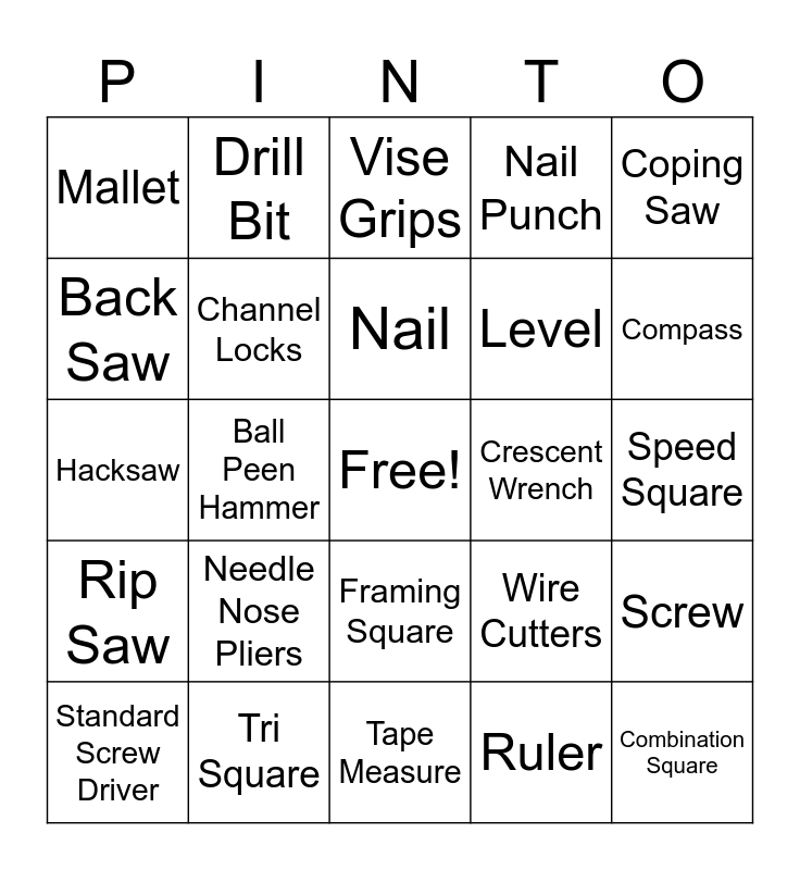 This bingo card has a free space and 29 words: Standard Screw Driver, Phillips Screw Driver, Ball Peen Hammer, Claw Hammer, Mallet, Vise Grips, Channel Locks, Needle Nose Pliers, Crescent Wrench, Tri Square, Speed Square, Combination Square, Tape Measure, Ruler, Compass, Framing Hammer, Framing Square, Rip Saw, Coping Saw, Hacksaw, Wire Cutters, File, Level, Back Saw, Nail Punch, Drill Bit, Screw, Nail and Pencil.