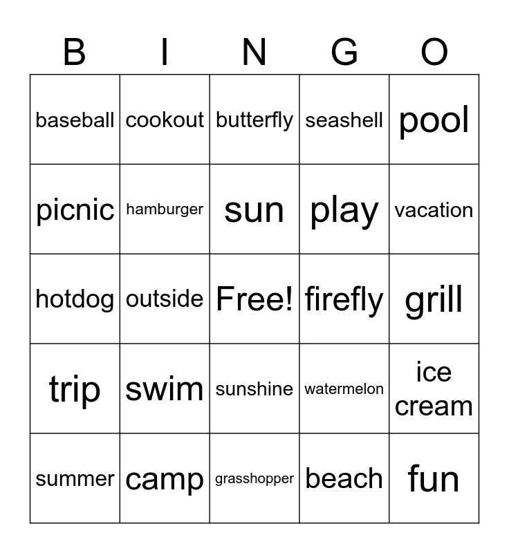This bingo card has a free space and 24 words: summer, swim, sun, beach, pool, baseball, cookout, butterfly, firefly, grill, hotdog, hamburger, watermelon, ice cream, picnic, camp, grasshopper, seashell, vacation, trip, outside, sunshine, play and fun.