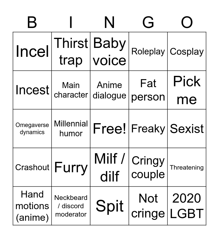 This bingo card has a free space and 24 words: Furry, Neckbeard / discord moderator, Anime dialogue, Hand motions (anime), Cosplay, Incel, Incest, Thirst trap, Freaky, Milf / dilf, Fat person, Omegaverse dynamics, Cringy couple, Threatening, Main character, Not cringe, Sexist, Baby voice, Pick me, Millennial humor, 2020 LGBT, Crashout, Roleplay and Spit.