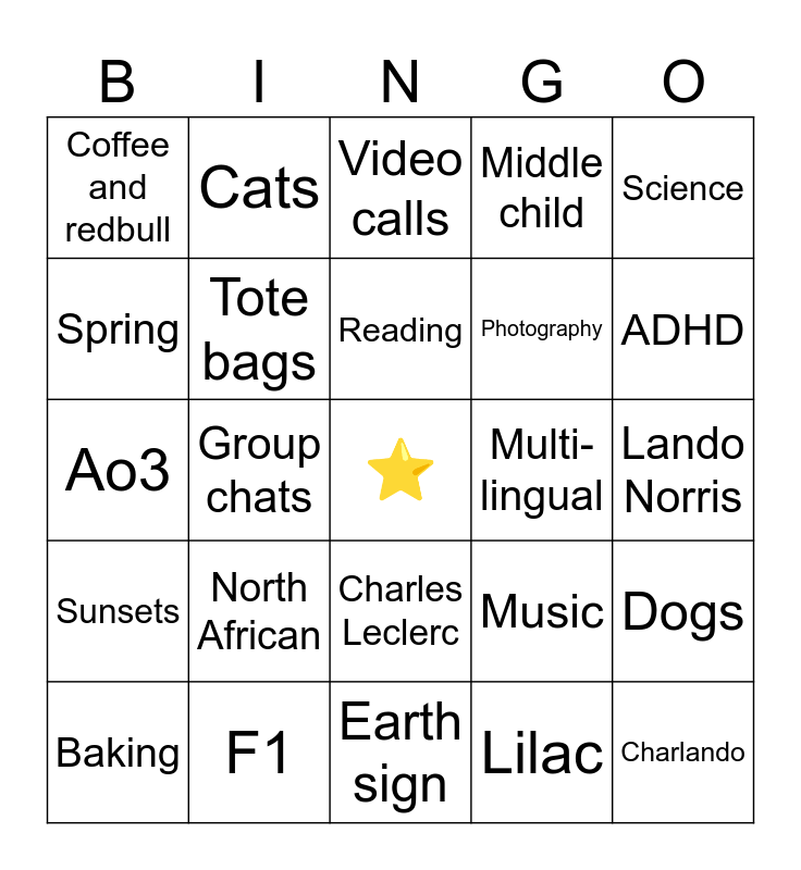 This bingo card has a free space and 24 words: North African, F1, Reading, Baking, Science, Coffee and redbull, Spring, Cats, Multi-lingual, Charles Leclerc, Photography, Ao3, Music, Dogs, Tote bags, Lilac, Lando Norris, Video calls, ADHD, Group chats, Charlando, Sunsets, Middle child and Earth sign.