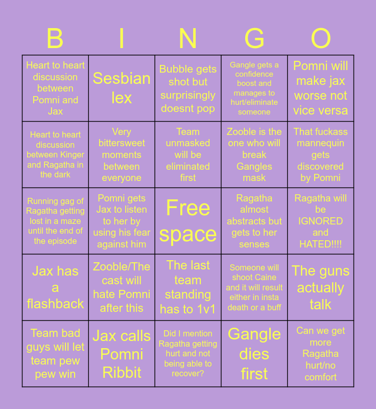 This bingo card has a free space and 24 words: Zooble/The cast will hate Pomni after this, Jax calls Pomni Ribbit, Team unmasked will be eliminated first, Team bad guys will let team pew pew win, Pomni will make jax worse not vice versa, Heart to heart discussion between Pomni and Jax, Heart to heart discussion between Kinger and Ragatha in the dark, Sesbian lex, Ragatha almost abstracts but gets to her senses, The last team standing has to 1v1, Zooble is the one who will break Gangles mask, Running gag of Ragatha getting lost in a maze until the end of the episode, Someone will shoot Caine and it will result either in insta death or a buff, The guns actually talk, Very bittersweet moments between everyone, Gangle dies first, Ragatha will be IGNORED and HATED!!!!, Bubble gets shot but surprisingly doesnt pop, That fuckass mannequin gets discovered by Pomni, Pomni gets Jax to listen to her by using his fear against him, Can we get more Ragatha hurt/no comfort, Jax has a flashback, Gangle gets a confidence boost and manages to hurt/eliminate someone and Did I mention Ragatha getting hurt and not being able to recover?.