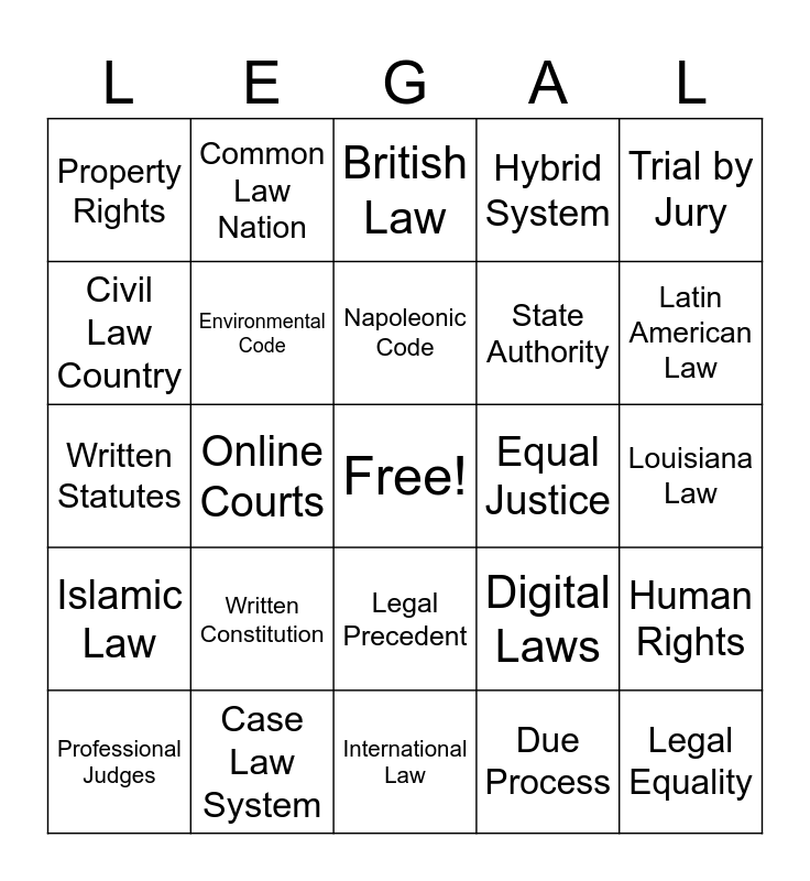 This bingo card has a free space and 24 words: Written Constitution, Case Law System, Napoleonic Code, Professional Judges, Trial by Jury, Property Rights, Civil Law Country, Common Law Nation, Equal Justice, Legal Precedent, State Authority, Written Statutes, Digital Laws, Human Rights, Environmental Code, Due Process, Louisiana Law, British Law, Latin American Law, Online Courts, Legal Equality, Islamic Law, Hybrid System and International Law.