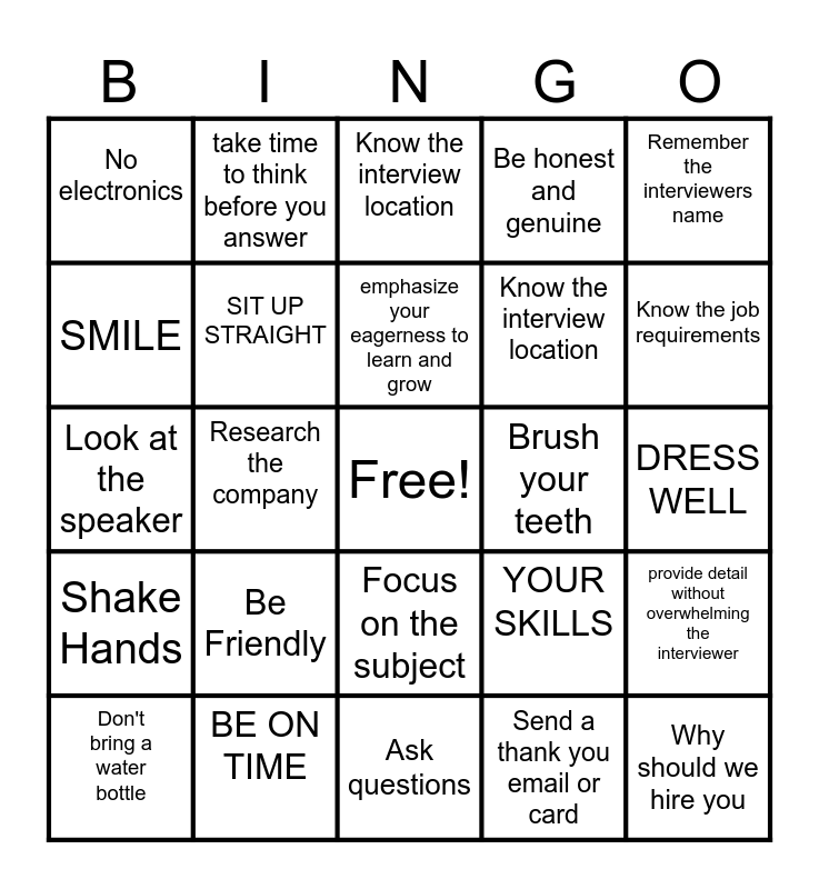 This bingo card has a free space and 29 words: Don't bring a water bottle, Look in the mirror, Research the company, Do Not interrupt, No electronics, Know the interview location, SIT UP STRAIGHT, Be Friendly, Brush your teeth, BE ON TIME, DRESS WELL, Why should we hire you, Ask questions, Send a thank you email or card, Know the job requirements, strengths and weaknesses, Focus on the subject, Shake Hands, Remember the interviewers name, Look at the speaker, YOUR SKILLS, Don't wear tennis shoes/jeans, Know the interview location, SMILE, Be honest and genuine, take time to think before you answer, provide detail without overwhelming the interviewer, emphasize your eagerness to learn and grow and Provide examples of your skill and achievements.