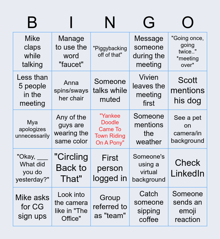 This bingo card has a free space and 24 words: "Circling Back to That", Look into the camera like in "The Office", Someone talks while muted, Mike asks for CG sign ups, "Going once, going twice.." *meeting over*, Mike claps while talking, Less than 5 people in the meeting, Manage to use the word "faucet", Someone mentions the weather, First person logged in, Vivien leaves the meeting first, Mya apologizes unnecessarily, Someone's using a virtual background, Check LinkedIn, Anna spins/sways her chair, Catch someone sipping coffee, See a pet on camera/in background, "Piggybacking off of that", Scott mentions his dog, Any of the guys are wearing the same color, Someone sends an emoji reaction, "Okay, ___ What did you do yesterday?", Message someone during the meeting and Group referred to as "team".