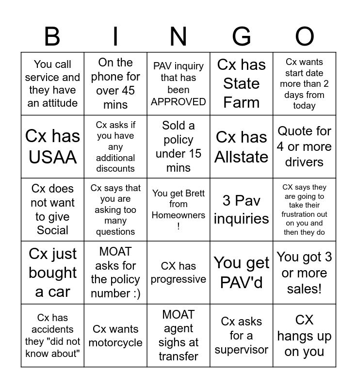 This bingo card has a free space and 31 words: MOAT agent sighs at transfer, Service transfers someone to you that needs to be in service, Cx says that you are asking too many questions, You get a cold transfer FROM service, You call service and they have an attitude, PAV inquiry that has been APPROVED, Cx asks if you have any additional discounts, You get PAV'd, 3 Pav inquiries, Cx asks for a supervisor, CX says they are going to take their frustration out on you and then they do, CX hangs up on you, Quote for 3 or more vehicles, You got a sale!, Quote for 4 or more drivers, MOAT does not answer in 2 mins, You got 3 or more sales!, MOAT asks for the policy number :), Cx just bought a car, CX has progressive, Cx wants start date more than 2 days from today, Cx is divorced, Cx has accidents they "did not know about", On the phone for over 45 mins, Cx has Allstate, Cx has USAA, Cx has State Farm, Cx does not want to give Social, Cx wants motorcycle, Sold a policy under 15 mins and Sold a recall.