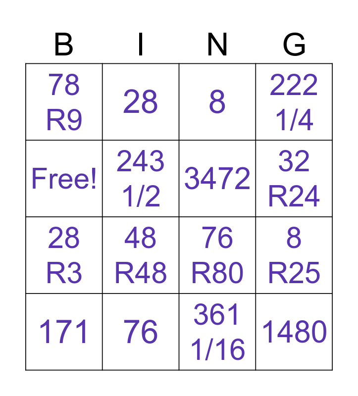 This bingo card has 16 words: 76, 8 R25, 8, 78 R9, 28 R3, 28, 76 R80, 361 1/16, Free!, 243 1/2, 171, 222 1/4, 48 R48, 32 R24, 3472 and 1480.