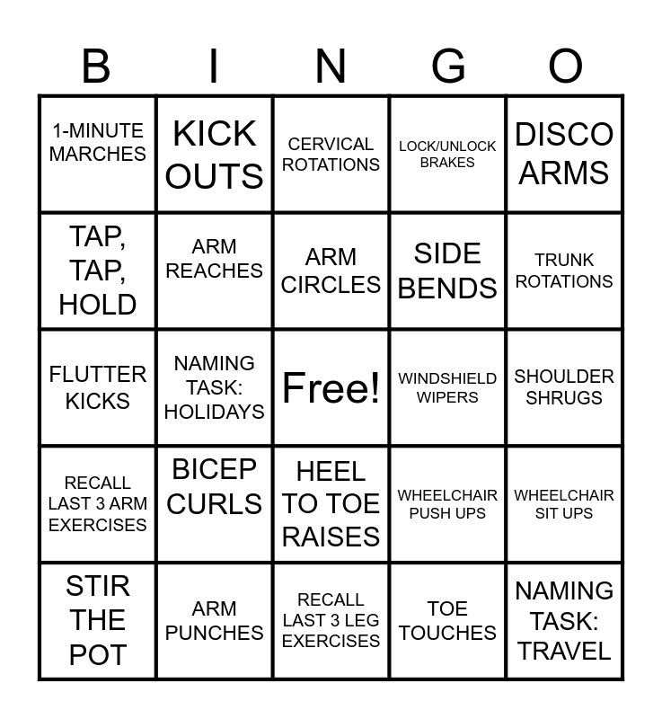 This bingo card has a free space and 24 words: BICEP CURLS, ARM PUNCHES, ARM CIRCLES, STIR THE POT, DISCO ARMS, 1-MINUTE MARCHES, TAP, TAP, HOLD, KICK OUTS, WINDSHIELD WIPERS, HEEL TO TOE RAISES, SIDE BENDS, FLUTTER KICKS, WHEELCHAIR PUSH UPS, WHEELCHAIR SIT UPS, ARM REACHES, TOE TOUCHES, SHOULDER SHRUGS, CERVICAL ROTATIONS, TRUNK ROTATIONS, NAMING TASK: HOLIDAYS, NAMING TASK: TRAVEL, RECALL LAST 3 ARM EXERCISES, LOCK/UNLOCK BRAKES and RECALL LAST 3 LEG EXERCISES.