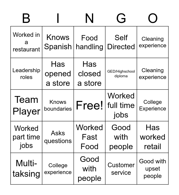 This bingo card has a free space and 28 words: Has worked retail, Knows more than 1 language, GED/Highschool diploma, Customer service, Leadership roles, Food handling, Knows Spanish, Worked part time jobs, Worked full time jobs, Multi-taksing, Team Player, Self Directed, College experience, Good with people, Cleaning experience, Cashier Experience, Asks questions, Has opened a store, Has closed a store, Worked Fast Food, Worked in a restaurant, Has pet/animal experience, Good with upset people, Knows boundaries, College Experience, Good with people, Cleaning experience and Cashier experience.