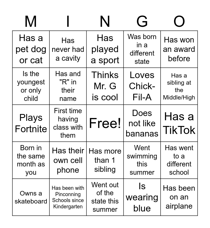 This bingo card has a free space and 24 words: Has their own cell phone, Has been with Pinconning Schools since Kindergarten, Thinks Mr. G is cool, Owns a skateboard, Has won an award before, Has a pet dog or cat, Is the youngest or only child, Has never had a cavity, Does not like bananas, Has more than 1 sibling, Loves Chick-Fil-A, Plays Fortnite, Went swimming this summer, Has went to a different school, Has and "R" in their name, Is wearing blue, Has a TikTok, Has played a sport, Has a sibling at the Middle/High, First time having class with them, Has been on an airplane, Born in the same month as you, Was born in a different state and Went out of the state this summer.